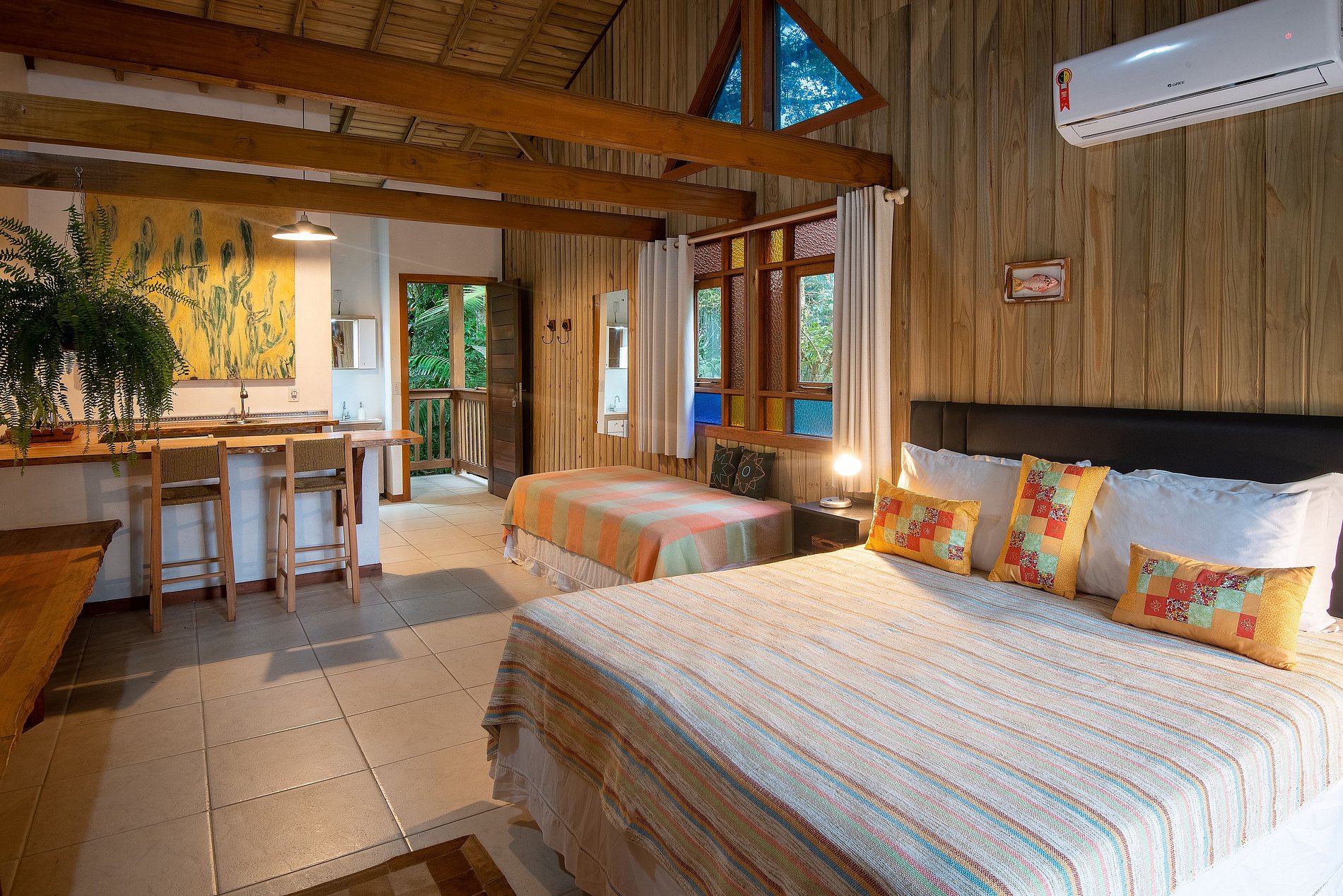 La decoración con obras de arte y artesanías tradicionales de Minas Gerais hacen que el ambiente sea acogedor, como el de la casa da gente, siendo el lugar ideal para su descanso en Praia do Rosa.