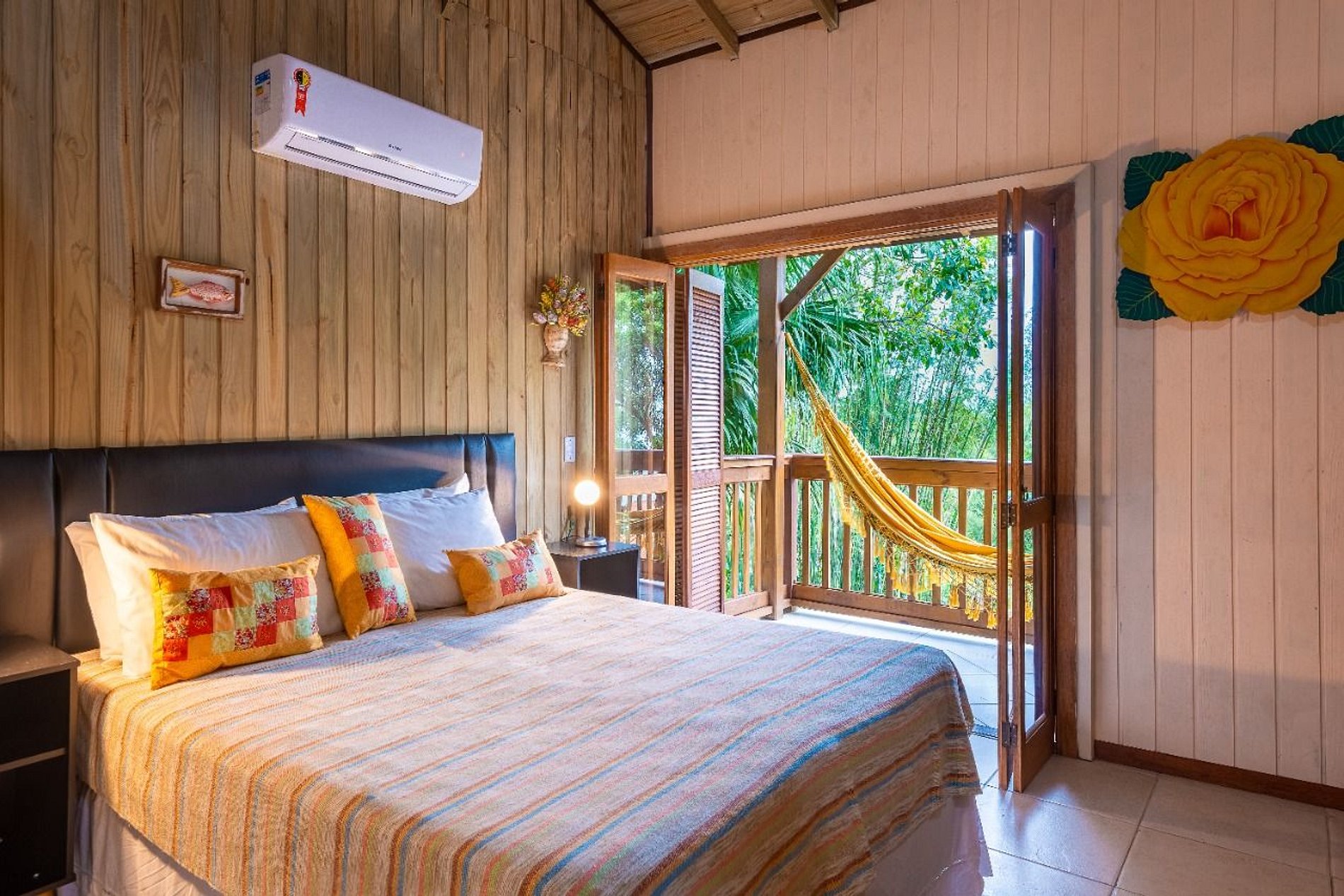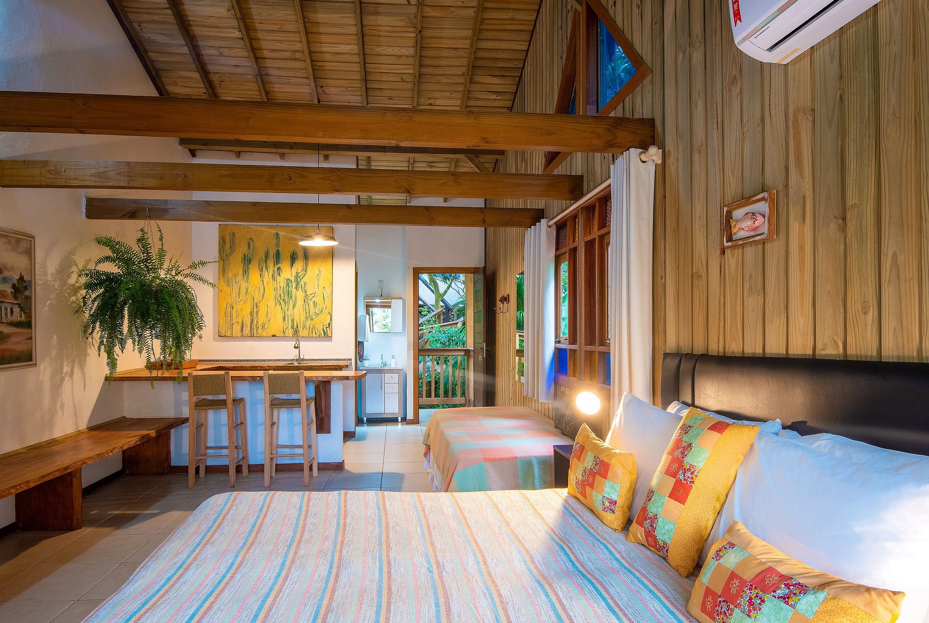 La decoración con obras de arte y artesanías tradicionales de Minas Gerais hacen que el ambiente sea acogedor, como el de la casa da gente, siendo el lugar ideal para su descanso en Praia do Rosa.