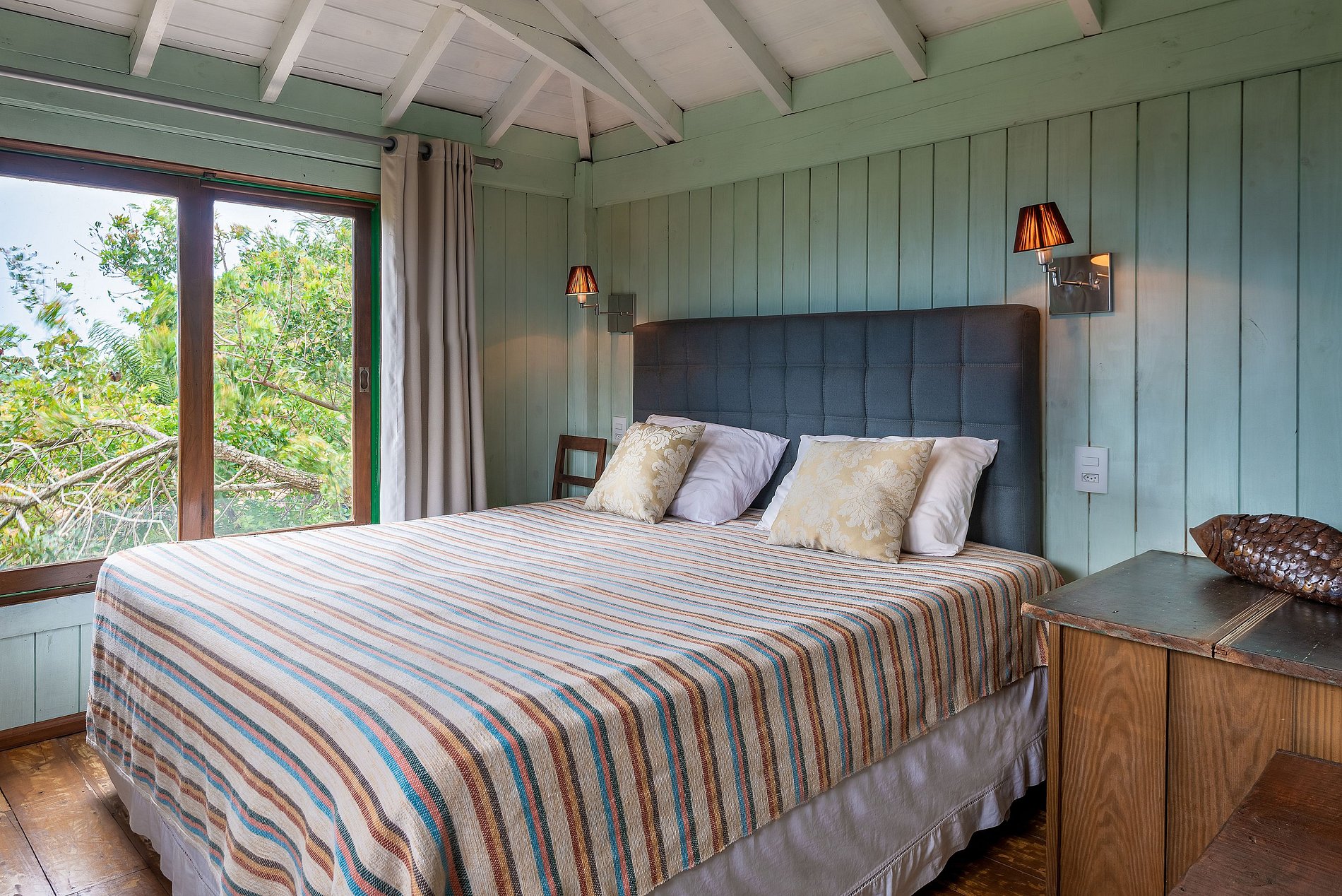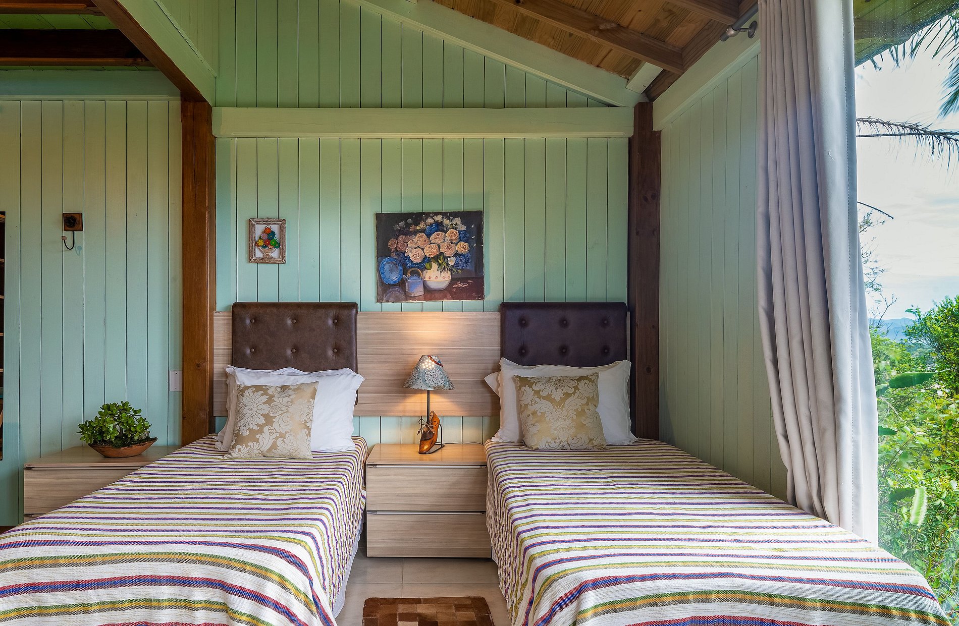 La decoración con obras de arte y artesanías tradicionales de Minas Gerais hacen que el ambiente sea acogedor, como el de la casa da gente, siendo el lugar ideal para su descanso en Praia do Rosa.