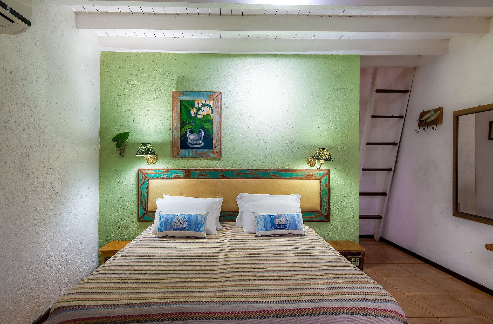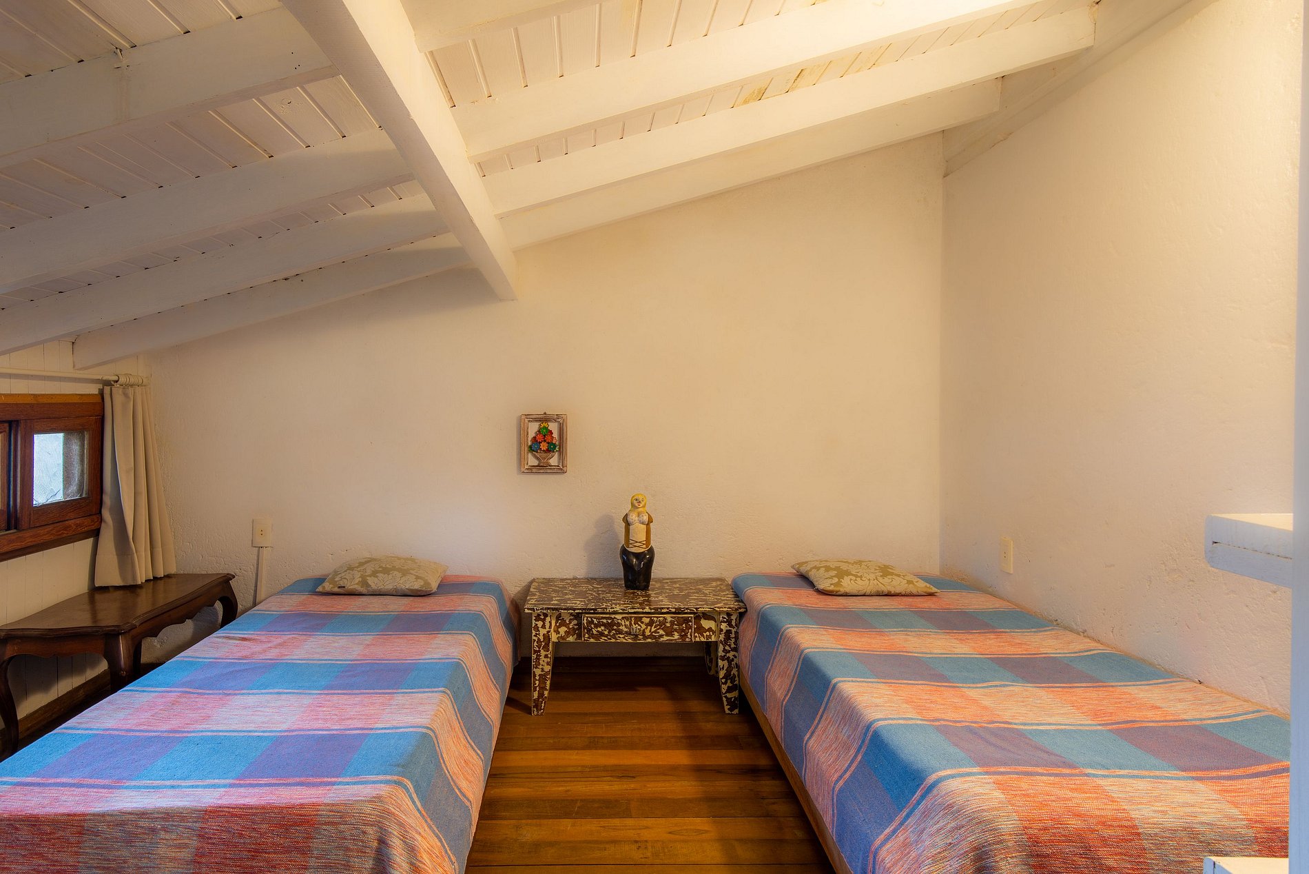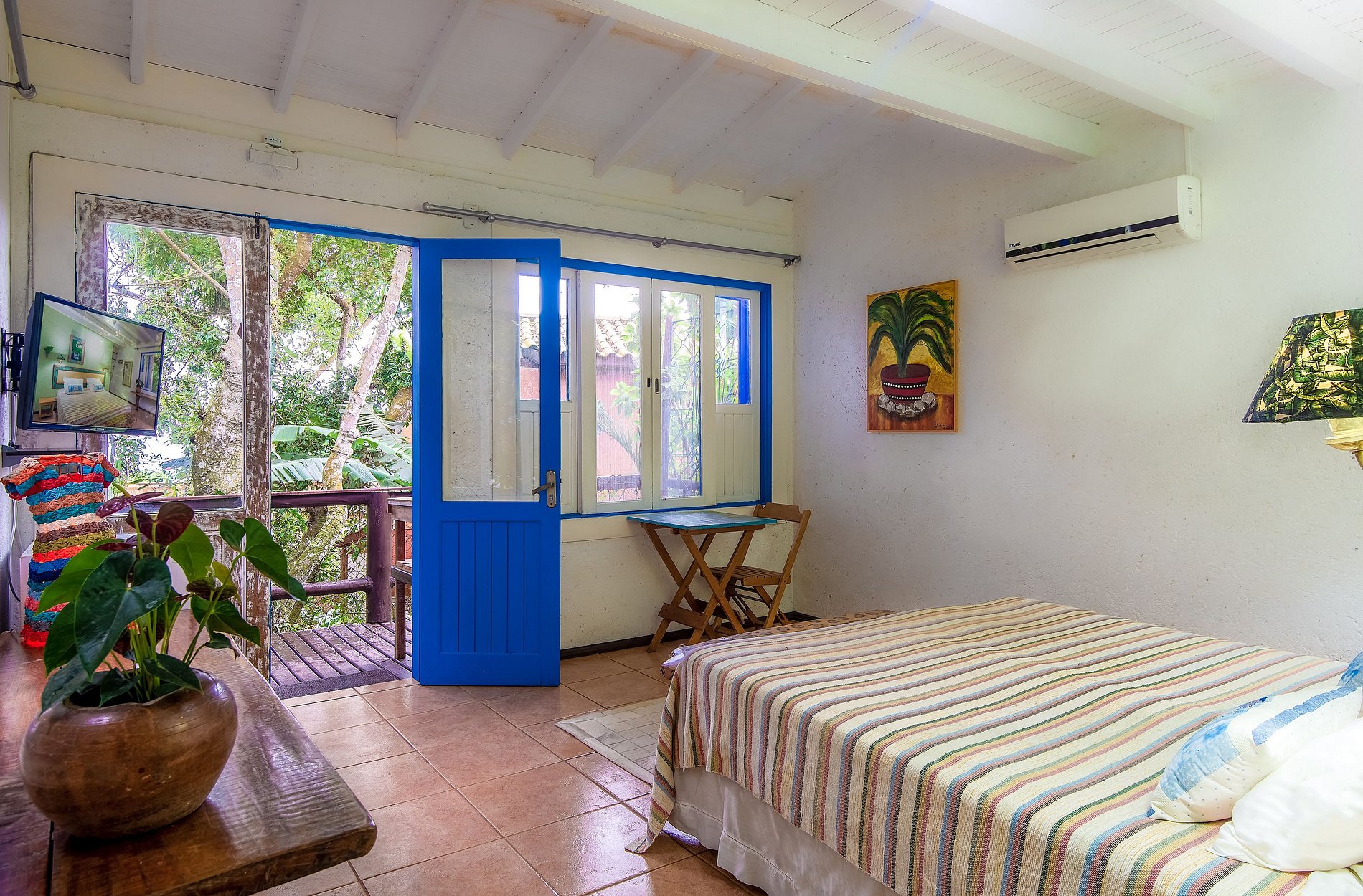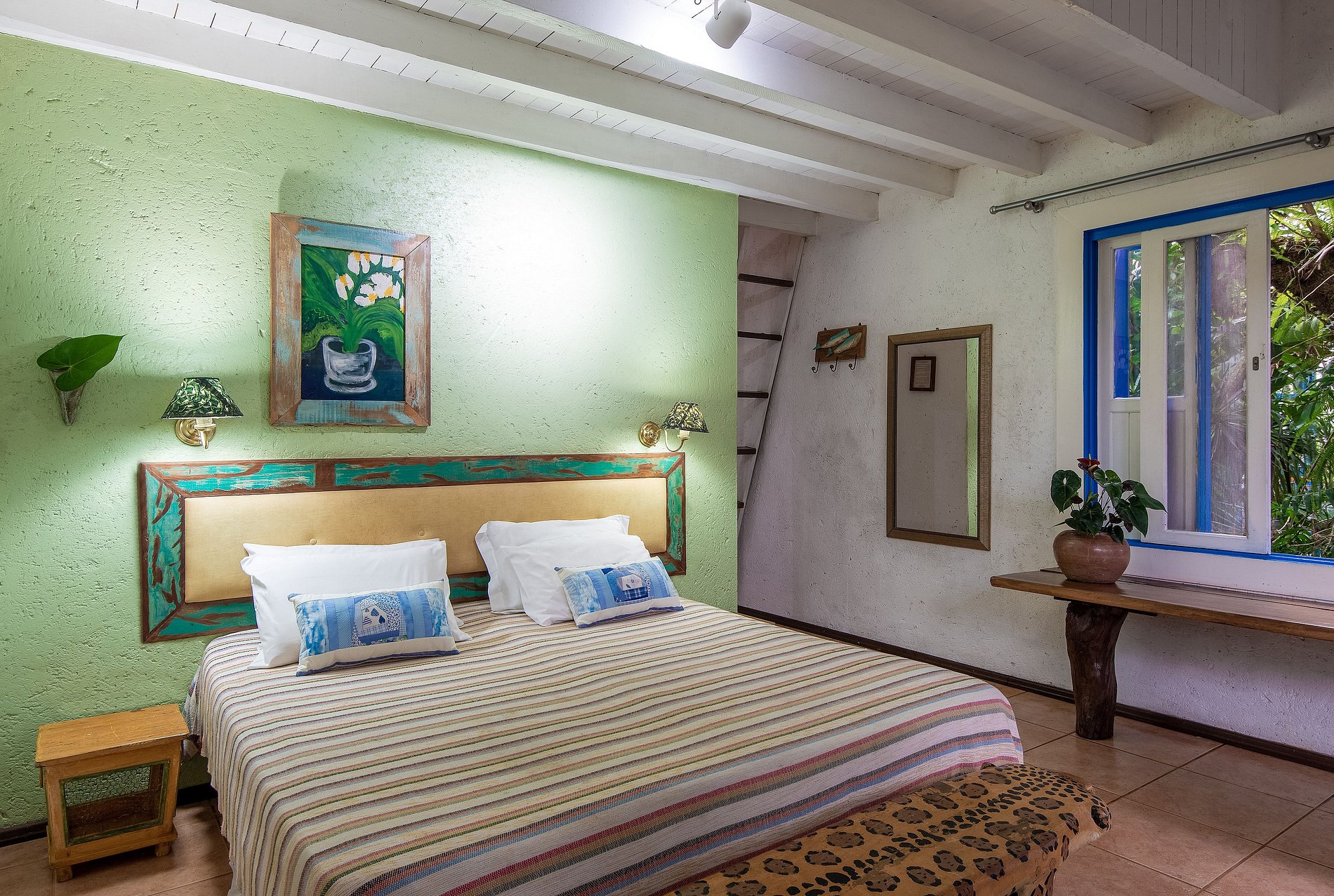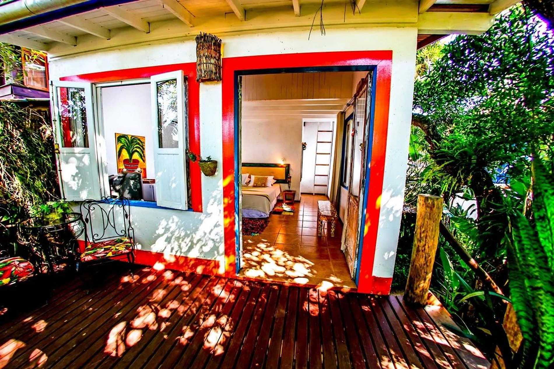 La decoración con obras de arte y artesanías tradicionales de Minas Gerais hacen que el ambiente sea acogedor, como el de la casa da gente, siendo el lugar ideal para su descanso en Praia do Rosa.